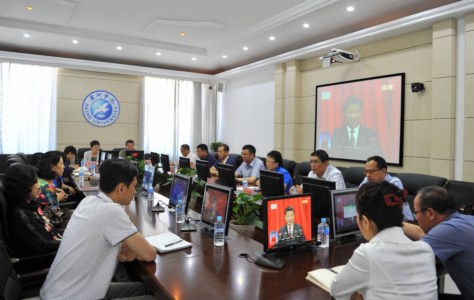 本网讯(记者 何振东 摄影 王佳 胥涵)7月1日上午10时,中国共产党成立95周年大会在北京人民大会堂隆重举行,习近平总书记出席大会并发表重要讲话,我校党委中心组成员、各部门负责人和师生同步收看大会盛况,共同回顾中国共产党95周年的奋斗历程,共同展望未来的发展前景。