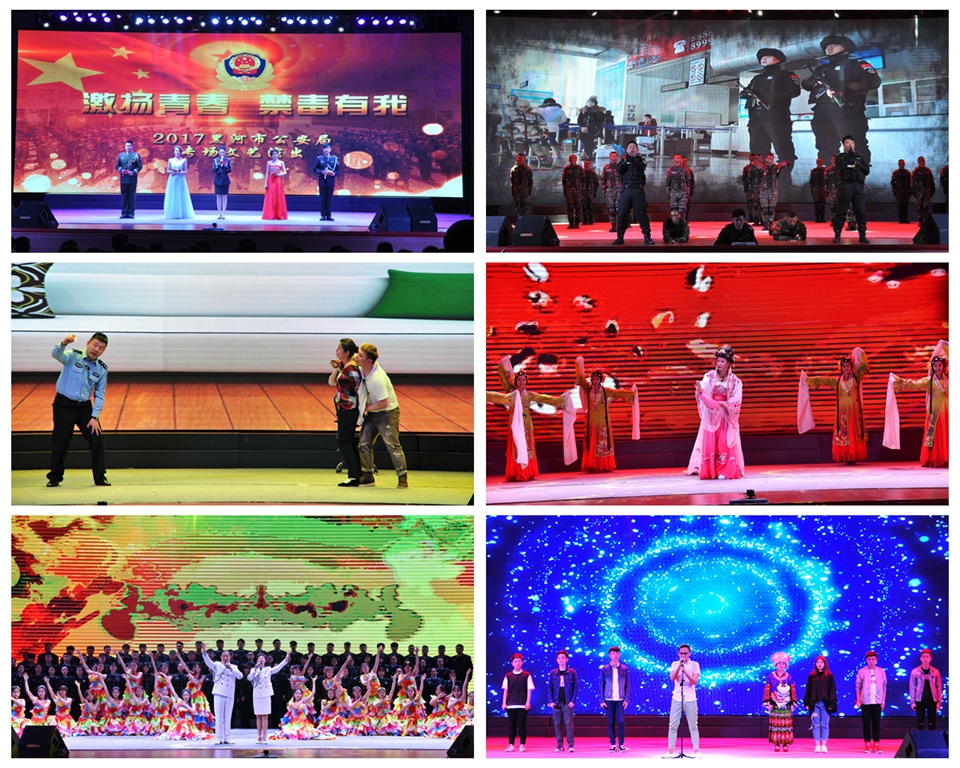演出在歌舞《人民公安向前进》中拉开了帷幕。我校学生与市公安局民警合作表演的配乐诗朗诵《呼唤》,以七位与毒品受害者相关联的人物角色抒发的内心独白来揭露毒品对个人、家庭及社会的危害,一段段情真意切的话语,真挚感人,引得不少观众为之落泪;歌曲《渴望光荣》与武警战士的擒拿格斗术相结合,展现了战士们的飒爽英姿和优良作风,以及同恶势力战斗到底的决心;警嫂演唱的京剧《梨花颂》,唱腔婉转、气势恢宏、意境华美,令人回味悠长;小品《母与子》讲述了一个平凡的缉毒警察坚守岗位,恪尽职守,用“舍小家、顾大家”的精神生动地诠释了爱岗敬业,小品情节生动,引起场下观众的共鸣,掌声连连;歌曲联唱《激扬青春》,精湛的表演、昂扬向上的精神风貌、各不相同的演唱风格将演出推向高潮,充分展示了我校学生深厚的演唱功底,现场爆发阵阵掌声欢呼声;歌曲《亲亲的黑河》《祖国不会忘记》《生命》、舞蹈《风筝误》也相继上演。最后,演出在歌舞《共圆中国梦》中圆满落幕。