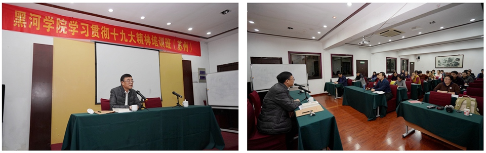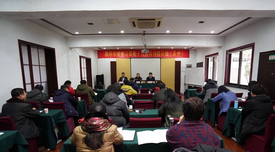 本网讯(特约记者 郑羽 摄影 曹福全)为深入学习贯彻党的十九大精神和习近平新时代中国特色社会主义思想,引导党员干部牢记使命、增强党性、凝聚力量、履职尽责,1月6日—9日,学校党委在黑龙江省委党校苏州培训基地举办“黑河学院学习贯彻十九大精神专题培训班”,通过专题辅导、现场教学、交流研讨等形式,副校长张焕强与学校26名中层干部围绕如何贯彻十九大精神,更好地推动学校建设和服务地方区域经济发展进行了深入学习,对如何在新时代全力践行新思想,激发新作为进行了深入思考。