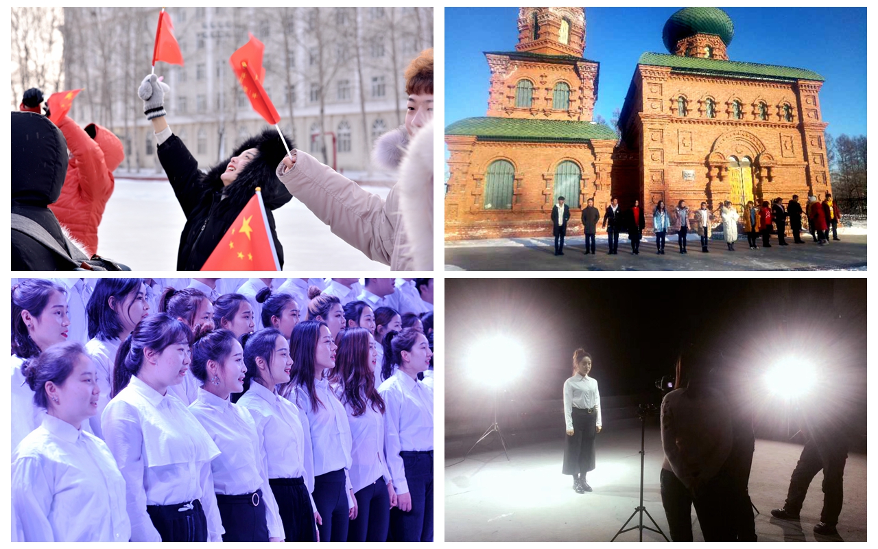此次活动由校团委具体负责,音乐学院合唱团学生全程参与,在指导教师苏超老师的带领下,学生们分别在我校和瑷珲古城、中俄风情园、植物园、边境口岸、中俄大桥等具有地域特色的场景,齐声合唱、拍摄校园版《中国梦》MV。“天气真的很冷,而且为了拍出精彩画面,有些女同学要穿着短袖在雪中拍摄,但同学们的热情都非常高,因为我们身在祖国边疆唱起属于我们这一代人的‘中国梦’,大家都觉得很自豪。”参与拍摄的宋佳慧同学说。《中国梦》大气磅礴的音乐仿佛一记鸣钟,击中了在场每个青年学生的内心,属于中国人的民族自豪感油然而生。值得一提的是,此次参与合唱录制的还有我校10名俄罗斯籍留学生。