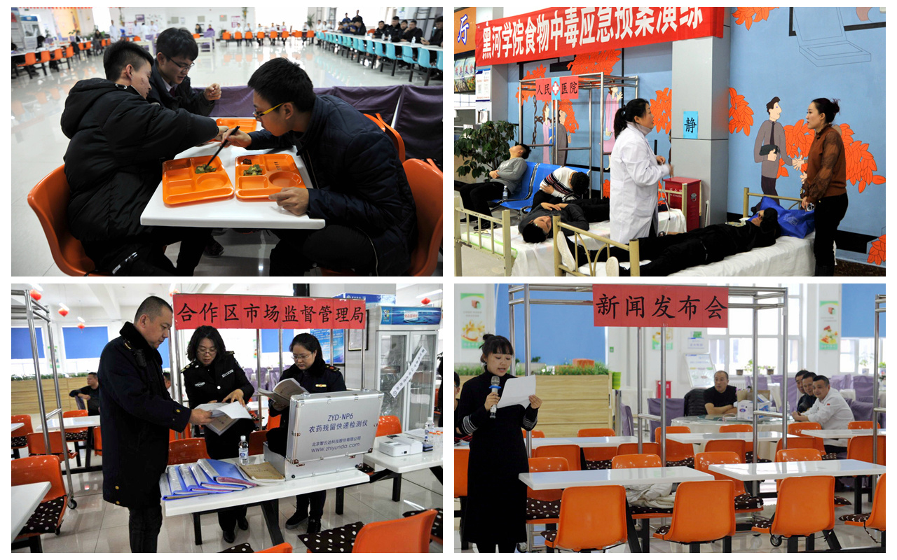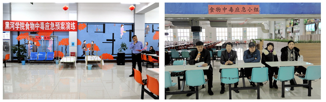 本网讯(记者 关月 摄影 张卓 张磊)为增强我校食品安全意识,提高应对突发公共卫生事件能力,11月21日下午,后勤管理处在稻香园餐厅三楼举行食物中毒应急演练。黑河市合作区市场监督管理局,校党委办公室、宣传统战部、保卫处、计算机与信息工程学院等相关部门观摩并全程参与演练。