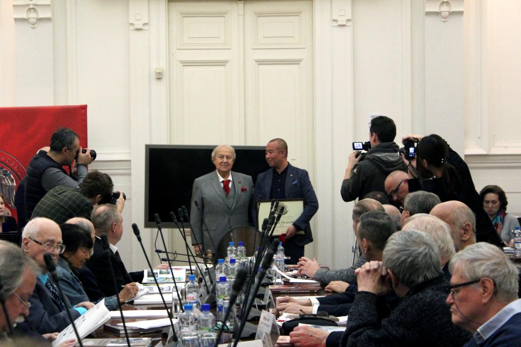《纪念列夫·托尔斯泰——战争与和平》系列作品于今年4月在莫斯科展出,经过俄罗斯艺术科学院主席专家团的评审,最终获得这一代表俄罗斯艺术科学院最高荣誉的奖项。俄罗斯联邦艺术科学院院长祖拉布·采列捷利为牟克颁发俄罗斯联邦艺术科学院金质奖章和证书。