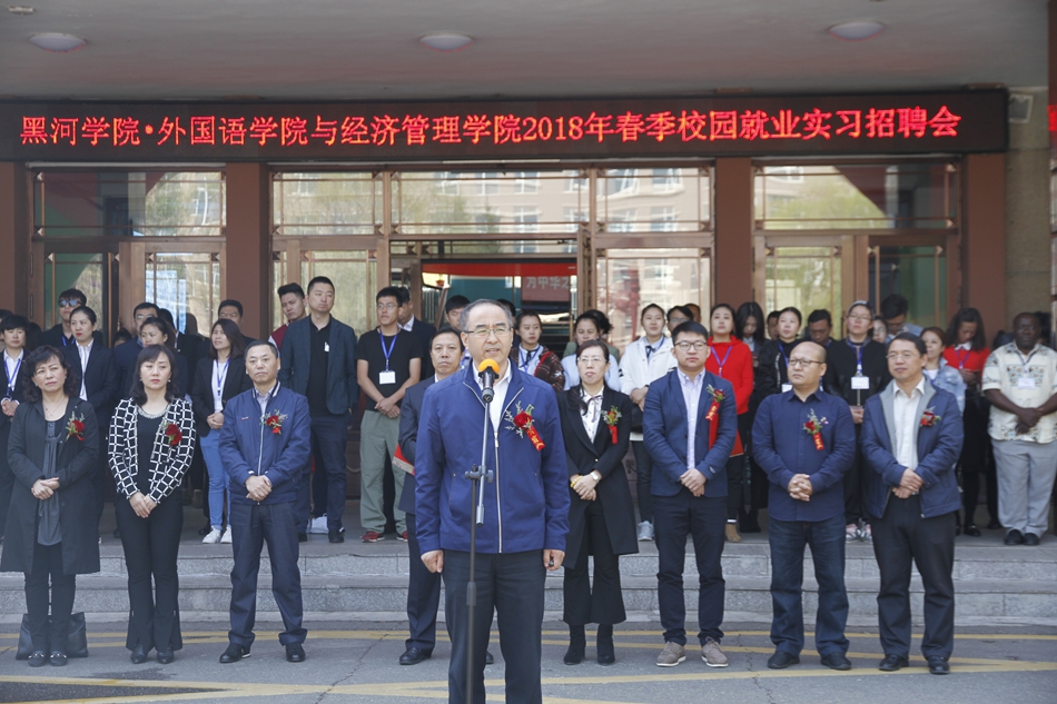 本网讯(特约记者 潘云辉)5月13日上午,黑河学院外国语学院与经济管理学院联合举办第三届“扬就业之帆,启梦想之旅”2018年春季校园就业实习招聘会。副校长许海深,全国人大代表、黑河工商联合会副主席、黑河中昌投资公司董事长王军出席招聘会开幕式。经济管理学院党总支副书记于维刚主持招聘会开幕式。