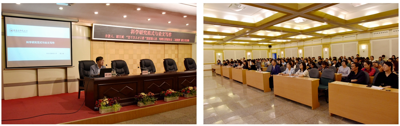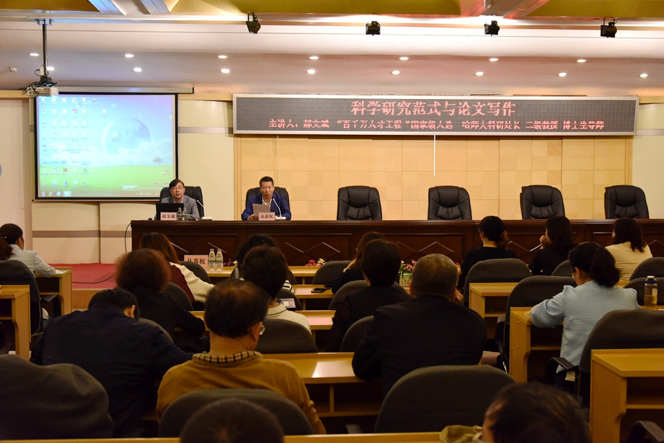 本网讯(记者赵宇 摄影 曲佳园)为进一步规范教师科学研究与论文写作,提升教师科研能力和水平,学校特邀哈尔滨师范大学博士生导师、二级教授郝文斌做客北疆讲坛,专题讲解“科学研究范式与论文写作”。副校长丛喜权,各教学科研单位主管科研工作负责人、学科带头人、学术骨干、科研秘书、各学科专业教师代表及科研处全体人员百余人参加讲座。讲座由副校长丛喜权主持。