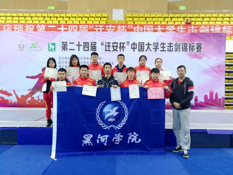 比赛中,我校学生敢打敢拼,一招一式飘逸洒脱,充分体现了北疆学子的果断勇敢、努力拼搏的体育精神。经过5天的激烈对决,体育学院学生白立臣荣获男子佩剑甲组个人第六名和“体育道德风尚奖运动员”称号,并与何鲁文、刘利思共同获得男子佩剑甲组团体第五名;姜春蕾、葛思辰、孙悦、陈婉怡四名学生荣获女子佩剑乙组团体第五名;指导教师范锐荣获“优秀教练员”称号,黑河学院被中国大学生体育协会授予“体育道德风尚奖运动队”。