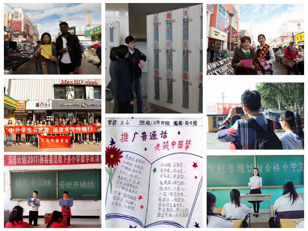 创新形式,推普工作取实效。9月15日,由黑河学院语言文字工作室及人文传媒学院联合主办的“社会用语用字调查”活动在黑河市区内进行,宫永利老师带领部分相关专业学生对黑河市部分店铺用语用字规范化情况进行了调研,对搜集的错别字和不规范用字情况进行汇总、整理,形成调查报告,并将发现的一些典型问题向有关部门反映,呼吁整改;9月16日上午,由人文传媒学院中文系主任王锐、国际教育学院副院长张航带领人文传媒学院学生推普志愿者、国际教育学院留学生及黑河市实验小学六年级学生共同开展了“构建和谐语言生活,弘扬中华优秀文化”的中外学生推普行活动。中外学生们积极向群众讲解普通话知识,发放由我校印制的推广普通话传单和宣传册,并现场教授俄罗斯朋友说普通话。留学生们流利的中文获得了市民的一致赞赏,促动市民群众在日常生活中坚持使用普通话;10月10日,“汉字与非物质文化遗产”主题展览在明德楼一楼大厅展出,文化旅游学院历史系主任杨正阳和学生们通过丝网印刷、热转印等技术将书法、篆刻、传拓作品体现在T恤、背包、书签等载体上,将非物质文化遗产以现代的方式进行展示,使师生们再次感受了汉字在书写、传承中华文化方面发挥的重要作用及独特艺术魅力;推普工作是一项基础性工作,也是精准扶贫的应有之义,学校充分发挥顶岗实习支教学生作用,在推普周期间,由顶岗实习支教带队教师为组长,各受援学校校长为副组长,各班班主任、语文老师为成员的推普活动领导小组走上街道、深入社区发传单送手册,在中小学校园里以广播、微视频、班会、朗读比赛等多种形式传播推广普通话,并为贫困家庭孩子建立帮扶档案,进行一对一重点推普助力脱贫。