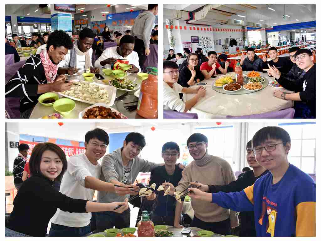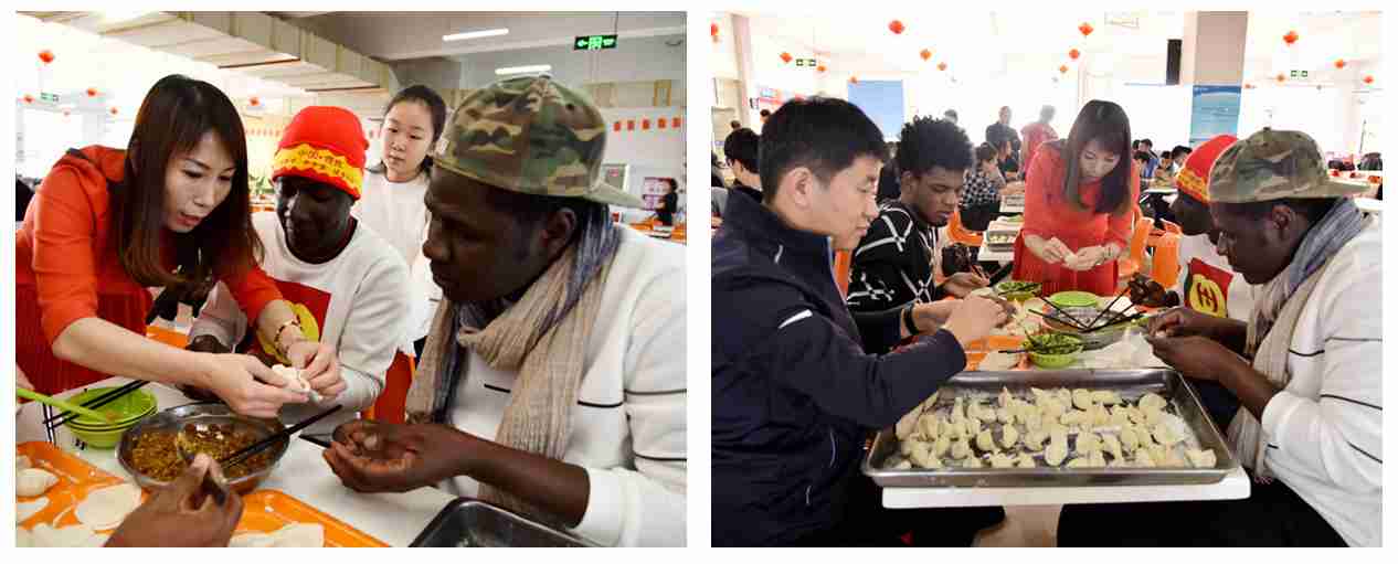 “将饺子的馅料放入圆形的饺子皮中,对折饺子皮,将饺子边缘向中间弯拢,两端的边角捏合成元宝状……”国际教育学院教师正在为留学生们讲解包饺子的要领,并手把手教留学生如何包好饺子。经过一番观察、学习,对中国美食制作非常感兴趣的留学生们也能熟练地包出漂亮饺子来了。“包饺子,让我更加了解中国的饮食文化,回家后我要做给我的父母吃,看,这个是我包的……”乍得留学生马丹纯选出自己最满意的“作品”说着。一阵忙碌过后,饺子上桌了,吃着热腾腾的饺子,学生们乐得合不拢嘴,喜悦之情溢于言表。