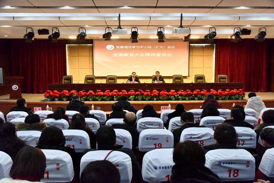 本网讯(记者 赵宇 摄影 关月)为深入学习宣传贯彻全国教育大会精神,切实把思想和行动统一到党中央决策部署上来,凝心聚力落实好大会决定的各项任务,12月26日,学校在求知楼报告厅召开党委理论学习中心组(扩大)会议暨全国教育大会精神宣讲会。学校党政领导班子、副科级以上干部、各学院辅导员、班主任、系主任、教研室主任参加学习。会议由党委委员、副校长张焕强主持。