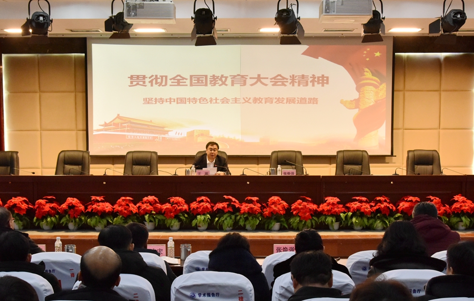 会上,党委书记王刚从“充分认识全国教育大会的重大意义”“深入学习领会习近平总书记关于教育的重要论述”“扎实推进加快教育现代化的重点任务”“全面确保教育大会精神落实落地”四个方面对全国教育大会精神进行宣讲。他指出,这次全国教育大会是一次划时代、历史性的会议,会议具有时机好、规格高、影响大几个突出特点。大会直面问题、回应期盼,为新时代教育改革发展的伟大实践指明了方向,科学地回答了“培养什么人、怎样培养人、为谁培养人”等一系列根本性的问题。学校要以“九个坚持”为根本遵循,着力做好“六个下功夫”,筑牢师生思想根基;要坚持党对教育的全面领导,坚持马克思主义指导地位,牢牢坚持立德树人的根本任务,逐步完善学校“三全育人”体系,促进学生德智体美劳全面发展。