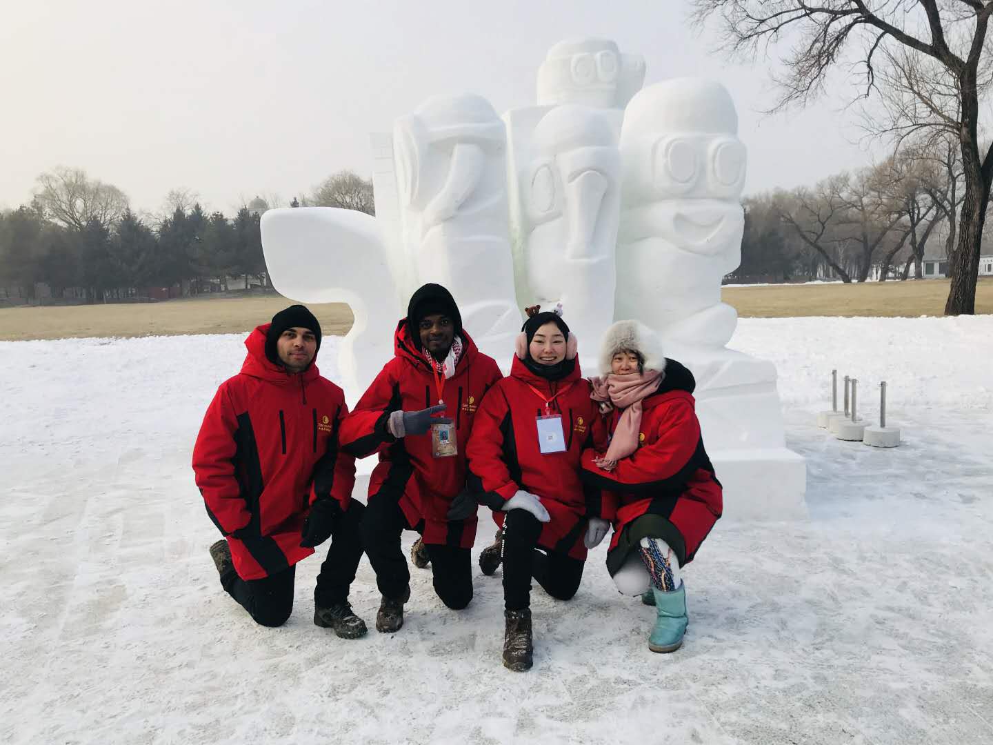 我校代表队由国际教育学院教师姜皓、美术与设计学院教师黄剑带领来自乍得、俄罗斯、土耳其的三名留学生组成。在27立方米的正方体雪坯上,三位同学共同完成作品《一家亲》,寓意中外师生相隔万里却相知相交,肤色不同却患难与共,语言各异却亲如一家。