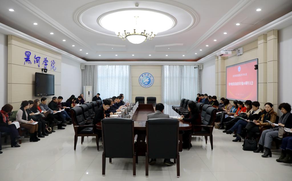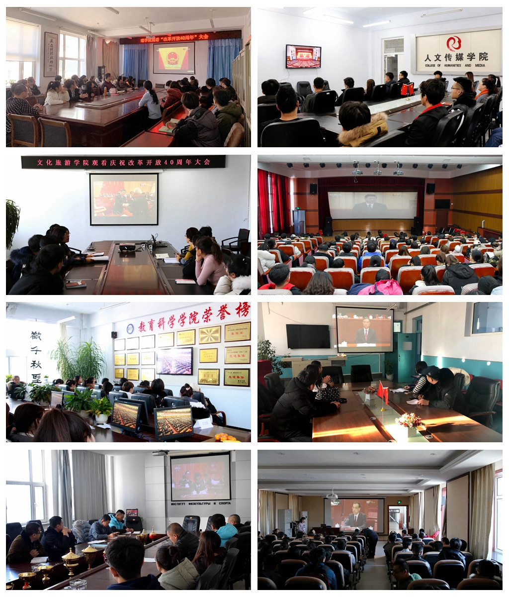上午9时40分,学校在明德楼二楼会议室召开党委理论学习中心组扩大会议,集中收看庆祝改革开放40周年大会直播。党政领导班子成员,各学院院长、党总支书记,各部门负责人仔细聆听习近平总书记的重要讲话,认真记录讲话内容,就相关问题展开讨论,感受改革开放辉煌成就。
