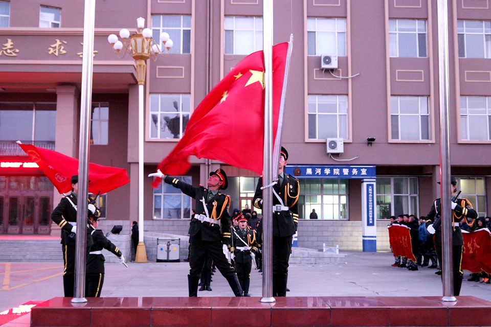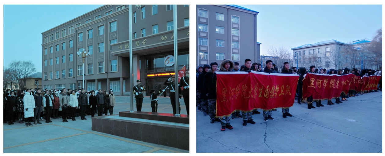 早上7时,北疆黑河的气温低至零下二十五度,国旗护卫队的旗手踏着铿锵有力的步伐,饱含热情,护卫着五星红旗走向国旗台。当雄壮的《义勇军进行曲》响彻校园,鲜艳的五星红旗承载着历史的风潮和时代新青年的憧憬期愿,迎着朝阳冉冉升起,仿佛历史的风潮吹回83年前,青年昂立的身影昭示着国家的未来、民族的希望。“我们站在和平的大地上怀念先烈们,无以为报,只能让中国的未来在我们手中更加辉煌!”学生代表刘羽西国旗下的演讲、呼吁同学们不能遗忘屈辱史,更不能遗忘中华民族志士仁人尤其是青年学生为争取独立与解放付出的努力与牺牲。随后,全体师生在国旗下宣誓,慷慨激昂的誓词,表达了师生对先烈的缅怀之情,抒发了时代青年激扬的报国之志。