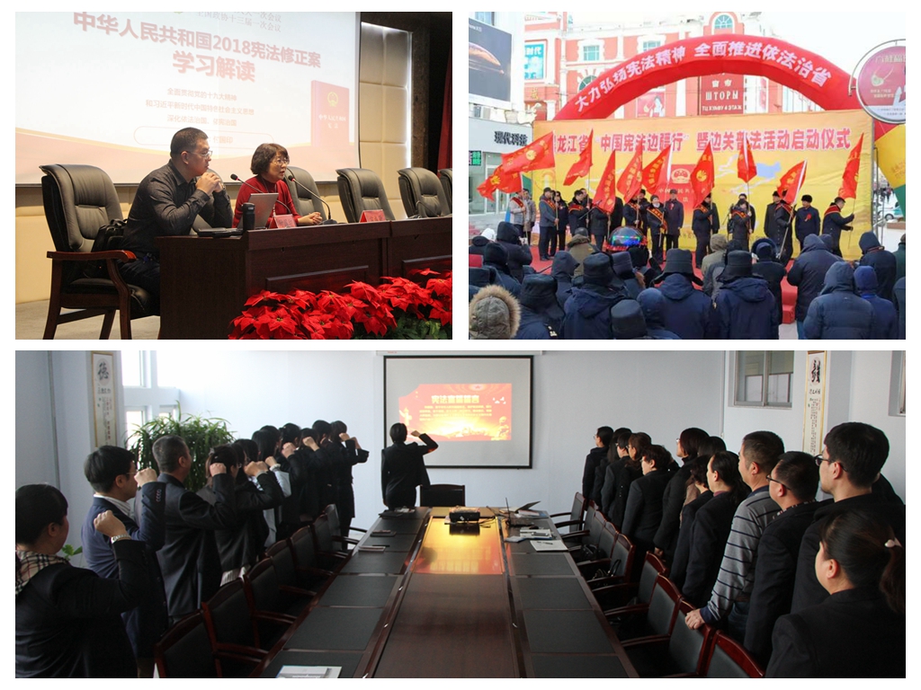 12月4日国家宪法日当天,文化旅游学院结合专业开展了“学宪法 讲宪法”主题讲座,法学系教师付国印对宪法的重要作用、宪法修正的具体内容进行细致讲解,阐述了学习宪法、尊崇宪法、维护宪法的重要意义,进一步增强了同学们维护宪法、捍卫宪法的思想自觉和行动自觉;12月5日,付国印老师受邀为黑河市民族宗教政策法规培训班300余名学员讲授了《2018宪法修正案》,使与会人员对宪法修正的时代背景、主要内容、主要特点有了更加深刻的认识。“我宣誓:忠于宪法,维护宪法权威……”在12月5日举行的宪法宣誓活动中,教师们通过宪法宣誓,感受到了宪法的庄严神圣,坚定了维护宪法权威的决心。12月7日,文化旅游学院法学系师生代表学校参加了由省司法厅在黑河市区举行的“中国宪法边疆行”暨边关普法活动启动仪式,现场展出我校制作的宪法知识宣传图板,向市民发放宪法宣传单,增强市民宪法观念,自觉履行好维护宪法尊严和保证宪法实施。
