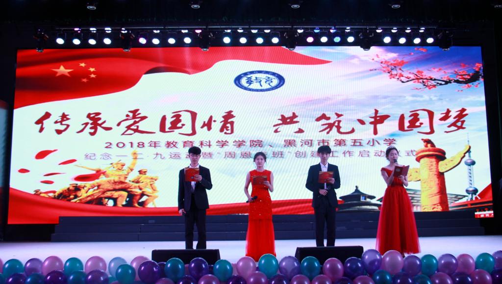 本网讯(特约记者 胡楠)为纪念一二•九运动83周年,缅怀革命先烈的丰功伟绩,推进“周恩来班”创建,12月9日下午,教育科学学院在明德楼礼堂举办“传承爱国情 共筑中国梦”合唱比赛暨“周恩来班”创建启动仪式。学生工作部、校团委、招生就业处相关负责人与我校附属小学黑河市第五小学师生代表参加活动。