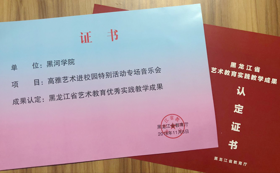 2018年7月12日,由黑龙江省教育厅、哈尔滨市文化广电新闻出版局主办的第34届中国·哈尔滨之夏音乐会“群星耀中华”市民音乐嘉年华系列文化活动黑河学院专场音乐会取得圆满成功,我校音乐学院中外师生联合俄罗斯哈巴罗夫斯克国立文化学院大学生舞蹈团成员们为现场观众奉上了一场精彩的文艺演出。近日,黑龙江省教育厅队参与单位进行了评审,我校的专场音乐会被评为黑龙江省艺术教育优秀实践教学成果奖,音乐学院教师苏超被认定为优秀指导教师。
