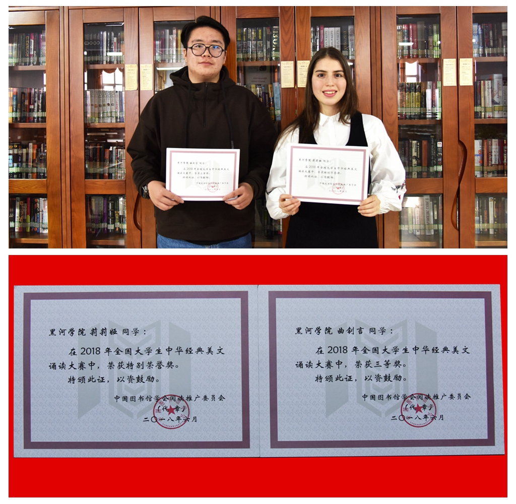 5月29日,由中国图书馆学会阅读推广委员会举办的“2018全国大学生中华经典美文诵读大赛”落下帷幕。图书馆选送的外国语学院学生曲钊言诵读的李白《将进酒》和国际教育学院留学生莉莉娅诵读的李清照《一剪梅》在全国300余所高校900个诵读作品中脱颖而出,分别荣获大赛三等奖和特别荣誉奖。