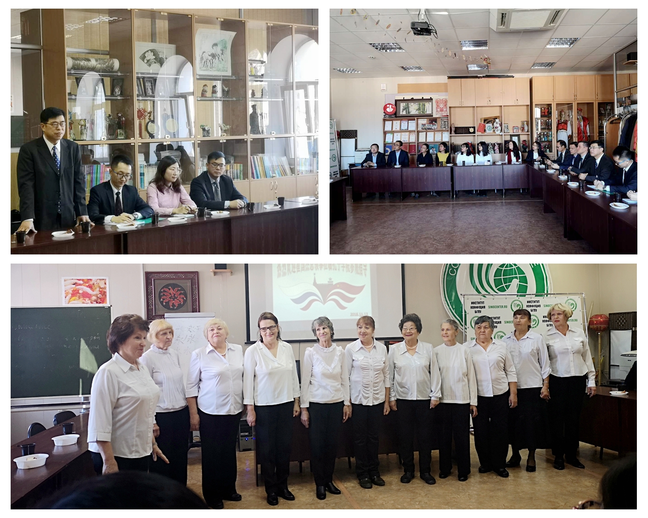孔子学院教学点——老年大学的学员们为访问团献上精彩演出,崔国杰总领事一行与孔子学院全体教师共同合唱俄文歌曲《莫斯科郊外的晚上》,以表达中俄两国人民之间的深情厚谊。