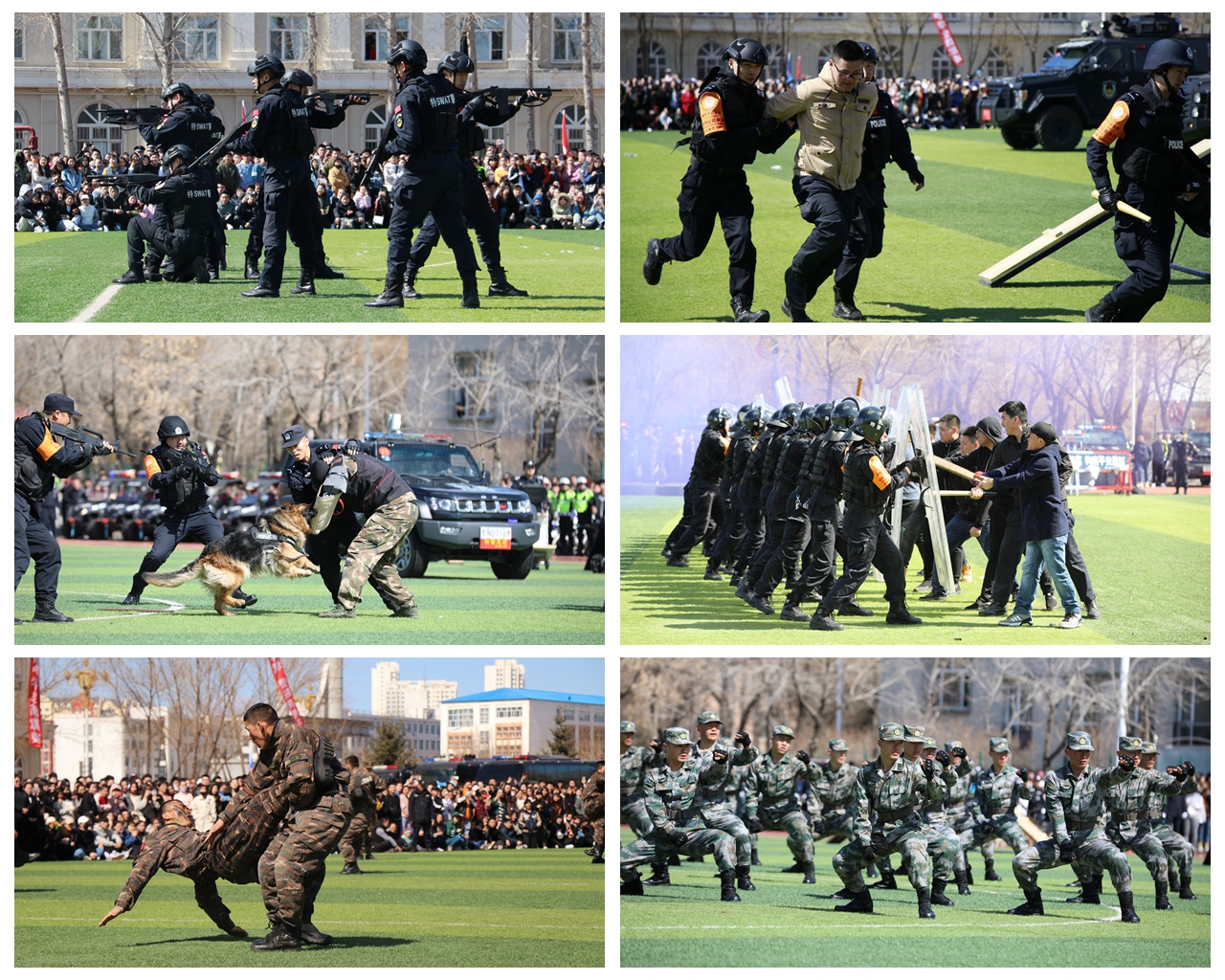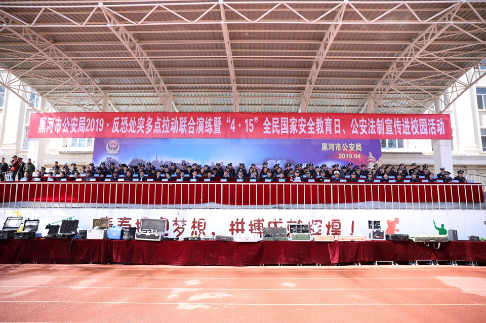 本网讯(记者 赵宇)为深入贯彻落实总体国家安全观,坚持以人民为中心的安全思想,全面筑牢边境地区和口岸城市及校园反恐安全屏障,全面提升“平安高校”创建水平,4月13日,黑河市公安局“2019·反恐处突多点拉动联合演练暨‘4·15’全民国家安全教育日、公安法制宣传进校园”主题活动在我校隆重举行。市政府副市长、市反恐怖工作领导小组副组长、市公安局党委书记、局长邓福才,中国人民解放军32110部队长、市反恐怖工作领导小组副组长贾国福,武警黑河支队支队长、市反恐怖工作领导小组副组长曹利民,我校党委书记王刚、副校长车永宏出席活动并观摩反恐实战演练;黑河市公安局机关和城区公安机关全体民警、辅警,我校师生代表和社区群众代表等共11000余人、警用车辆500余台参加活动。市公安局党委委员、副局长姜伟斌主持活动。