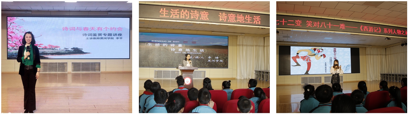 讲座分为三部分,李平老师讲授的《诗词与春天有个约会》,通过对古典诗词赏析,带领学生们回归那个诗意环顾的年代,体味春天的生机;李婧老师讲授的《生活的诗意诗意地生活》,带领同学们了解何谓诗歌,让学生们可以学会发现生活中的美,找寻生活中的诗意,学会诗意的生活;王锐老师讲授的《苦练七十二变笑对八十一难》,从家喻户晓的人物孙悟空着手,鼓励学生们“孙悟空是李世民,也即是人类心灵最完美的象征。”课堂上精彩不断,高潮迭起,学生学有所悟,学有所乐。