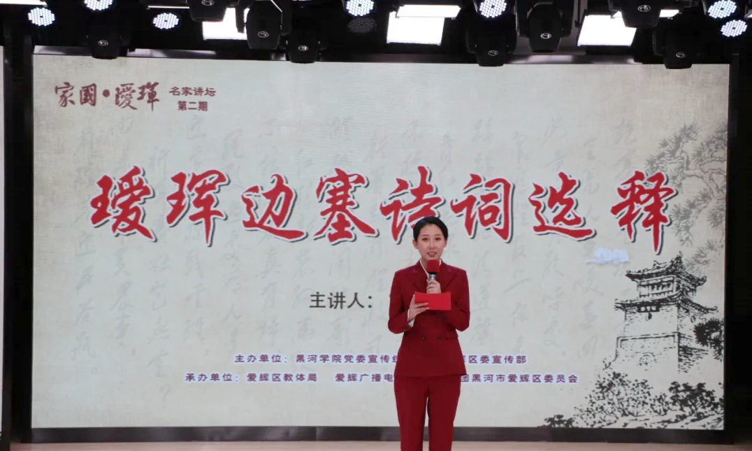 本网讯(记者 赵宇)11月13日,由学校党委宣传统战部、爱辉区委宣传部主办,爱辉区教体局、爱辉广播电视站、共青团黑河市爱辉区委员会共同承办的“家国·瑷珲”名家讲坛第二期——《瑷珲边塞诗词选释》在爱辉区演播大厅举办。