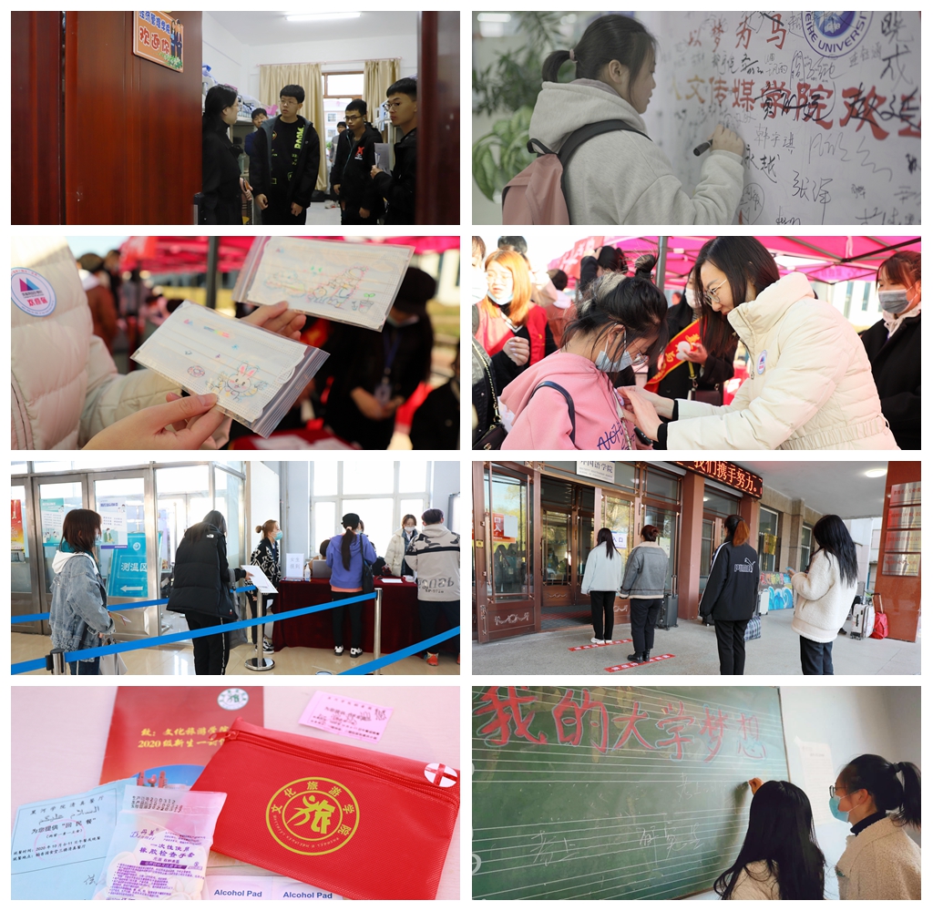人文传媒学院师生共同拍摄制作了迎新专题片,完整记录下新生在大学生涯开始之初的影像,并组织新生开展“你眼中的黑河学院”手机摄影大赛,让新生发挥专业特色纪录下对大学生活满满的憧憬,同时在校门口为新生和家长拍摄全家福,记录下这最温情的一刻,成为了迎新中的一大亮点,深受新生和家长的好评;理学院严格执行疫情防控要求,在新生报到处设置隔离带,严格按照“一线站一人 间隔一米 有序排队”的地贴位置排队办理;外国语学院特意为恰逢新生报到当天生日的2位新生寿星准备了一场暖心的生日会,以这种独特的方式欢迎他们加入黑河学院大家庭;教育科学学院“班代制度”“一对一”的快捷接待,实现了新生“零等待”目标;音乐学院特别设置了“我的大学梦想”留言墙和“我与音乐学院的第一张合影”,将来到学校的第一个签名和第一张合影汇集在签名墙上,留下初到的希冀,放飞希望与梦想;美术与设计学院为新生们准备了绘有“喜提新学年 防疫不放松”为主题的纪念口罩,精心设计印有学校校训和美术与设计学院院标的新生专属纪念胸章,在大学生活的第一天为新生留下珍贵回忆。