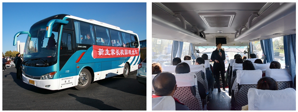 “欢迎各位家长来黑河学院参观……”按照疫情常态化防控要求,今年新生报到应由学生自己独立完成,但有些新生家长不远千里来到学校,想要看看孩子即将学习生活四年的校园。10月7—8日,学校为新生家长准备了校园观光车,最大限度满足家长参观校园要求。在车内,不仅安排了文化旅游学院的学生担任讲解员,还不间断播放学校的宣传片和新校门、游泳馆、综合体育馆等校园规划设计方案视频,家长们在车里拿着手机一直拍照、录小视频,对学校未来的发展充满了期待。