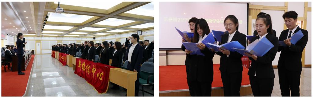由三个社团成员朗诵的《我们》,表达了身为学生记者的骄傲与信念;“我决心,心怀‘责任、敏锐、文笔、视野’,强新闻本领,塑记者品格,做真实、客观、有温度的报道……”一句句铮铮誓言,表达了学生记者坚定传递正能量,传播好声音,服务全校师生,共促校园文化繁荣发展的信心和决心。