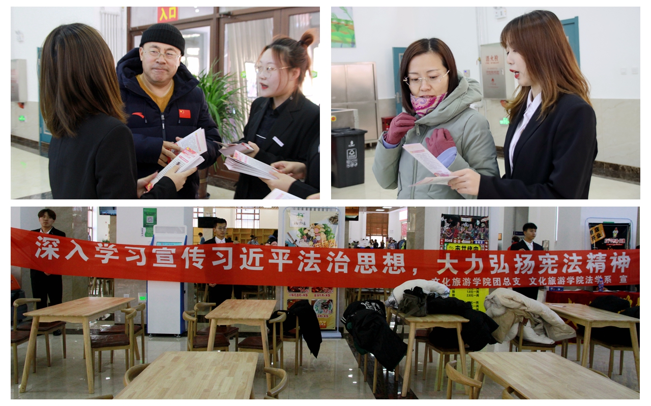文化旅游学院组织全校学生开展以“弘扬宪法精神建设法治中国”为主题的线上普法知识竞赛,并于12月4日,国家宪法日当天,在沁香园餐厅向师生发放“深入学习宣传习近平法治思想大力弘扬宪法精神”的法律知识宣传册,宣传宪法知识,不断增强学生的宪法意识、国家意识、规则意识。