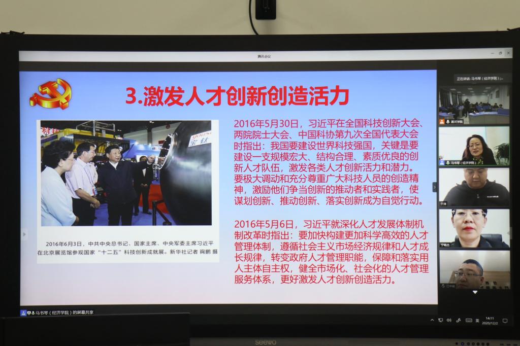 本网讯(特约记者 王小琬)12月2日下午,经济管理学院特邀哈尔滨师范大学经济学院院长、党的十九届五中全会省委宣讲团成员马书琴教授作《“十四五”时期经济社会发展的重点任务》专题线上讲座,审计处、财务处及经济管理学院全体教师参加学习。讲座由经济管理学院院长谢慧主持。