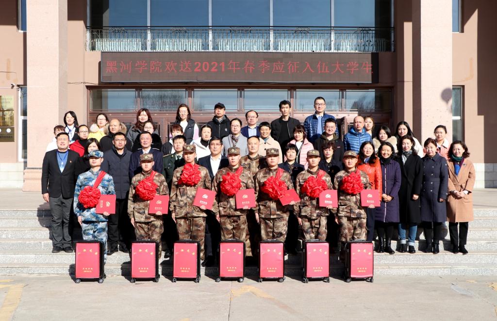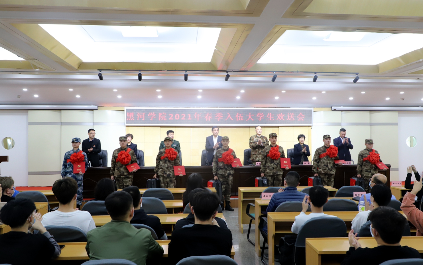 外国语学院2019级俄本2班李乘龙代表应征入伍同学感谢学校的培养,并表示到部队后一定严格要求自己,服从命令,严守纪律,刻苦训练,努力成为一名优秀的军人,为军队和国防建设做出自己的贡献,展现黑河学院学子的良好精神风貌。退役大学生2019级体育教育2班赵亮为即将入伍的学子送上祝福和嘱托。