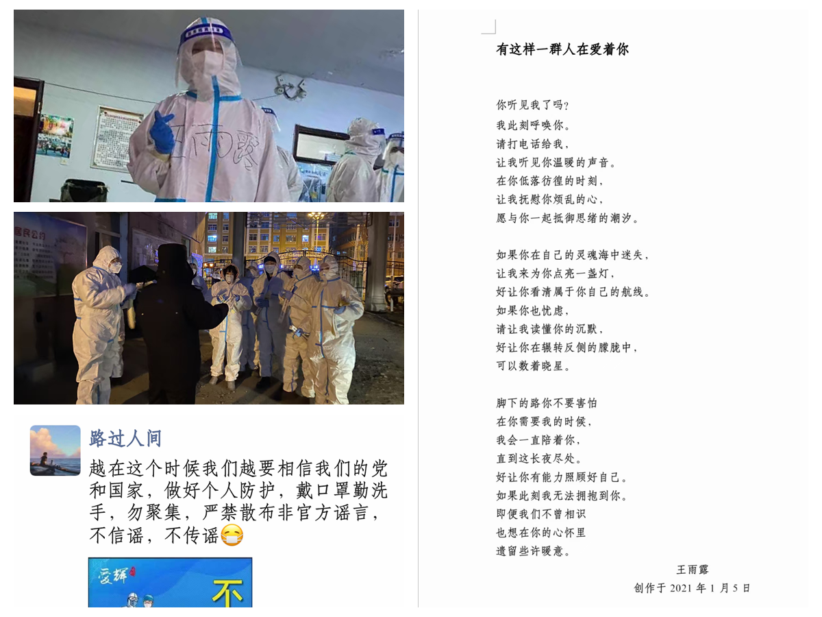 “那时候心情真的有些复杂,早上核酸检测的时候我根本不会想到被检测登记的我,晚上竟变成了登记其他检测者的人,也没想到我会在暮色中挨家挨户的贴封条,更没想到音乐专业的我居然也穿上了防护服站在了一线……这也是我第一次离新冠病毒这么近。当我们的面罩布满水汽看不清的时候,大爷大妈们会递给我们写满信息的纸条,大声地读出他们的身份证号,会感谢我们说‘辛苦了’……疫情无情人有情,无论如何也阻挡不了我们同为中国人的亲情,黑河加油!”王雨露在做志愿服务工作的同时会通过微信积极引导“朋友圈”中的好友不造谣不传谣,并通过诗歌的方式疏导朋友们的紧张情绪。