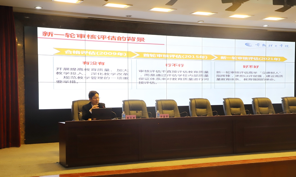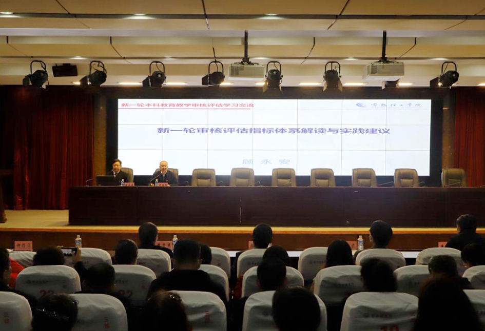 本网讯(记者 赵宇)为进一步做好新一轮审核评估准备工作,加深对审核评估的指导思想、基本原则、指标体系和审核要点等问题的了解,5月12日,学校特邀常熟理工学院顾永安教授,就新一轮审核评估有关知识和经验作专题讲座。学校领导班子成员、校院两级督导、各学院班子成员、系主任、学团办主任、办公室主任、专业带头人、学术骨干、教学秘书、教师代表,行政各处室(中心、部、院所)副处级以上干部、教务处和高教研究与教学质量评估中心全体人员聆听讲座。华中科技大学教育科学研究院博士生导师魏署光教授受邀到场参加讲座。讲座由副校长许海深主持。