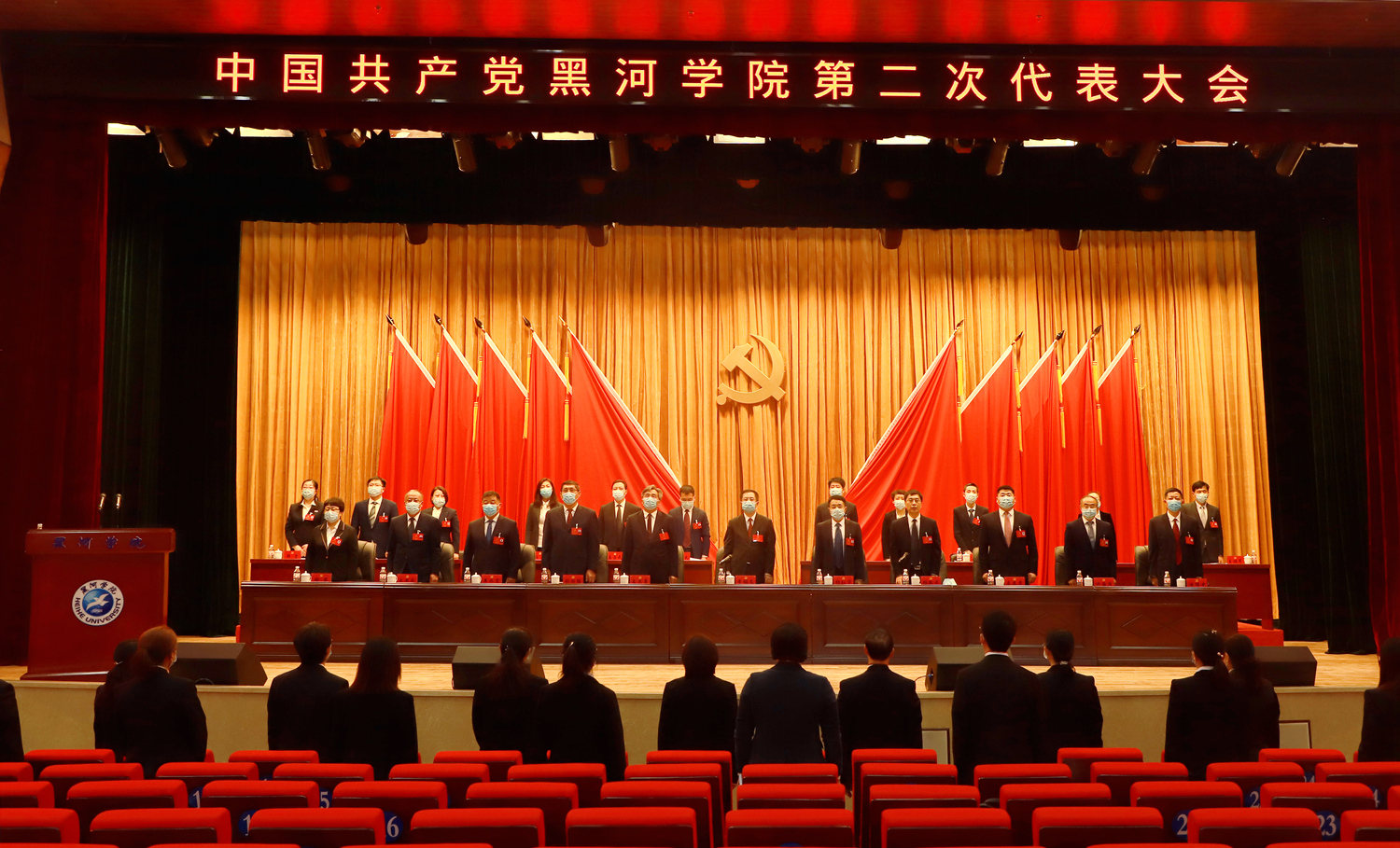 余春四月的北疆校园,激情飞扬,暖意涌动,开幕式会场气氛热烈。大会主席台上方悬挂着“中国共产党黑河学院第二次代表大会”的会标,鲜艳如火的党旗分列主席台两侧,正中簇拥着的金色党徽熠熠生辉。