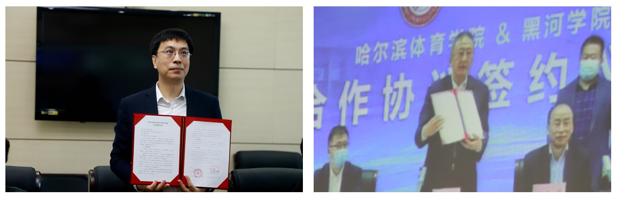 本网讯(记者 关月 特约记者 王健)5月19日,我校与哈尔滨体育学院在明德楼二楼会议室举行合作框架协议线上签约仪式。哈尔滨体育学院党委副书记、校长陈德明,副校长王金满,我校党委副书记、院长杨敬民,副院长谢慧和两校体育学院、国际教育学院、教务处、科研处、国际交流合作处等相关部门负责人参加签约仪式。