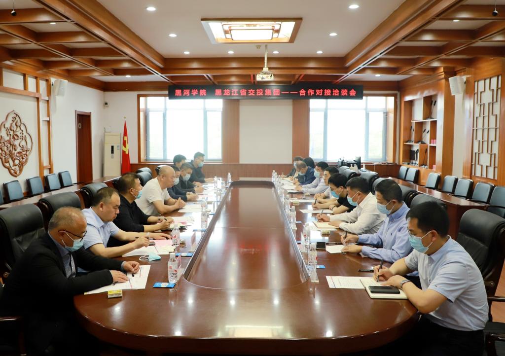 本网讯(记者 赵宇 特约记者 宋毅男)6月9日,黑龙江省交通投资集团有限公司(简称“交投集团”)党委书记、董事长尚云龙一行8人莅临我校,围绕产教融合、校企合作、基础设施建设等领域与党委书记杨弘宇,党委副书记、院长杨敬民进行了深入座谈交流。学校党政领导班子和相关部门负责人参加洽谈会。