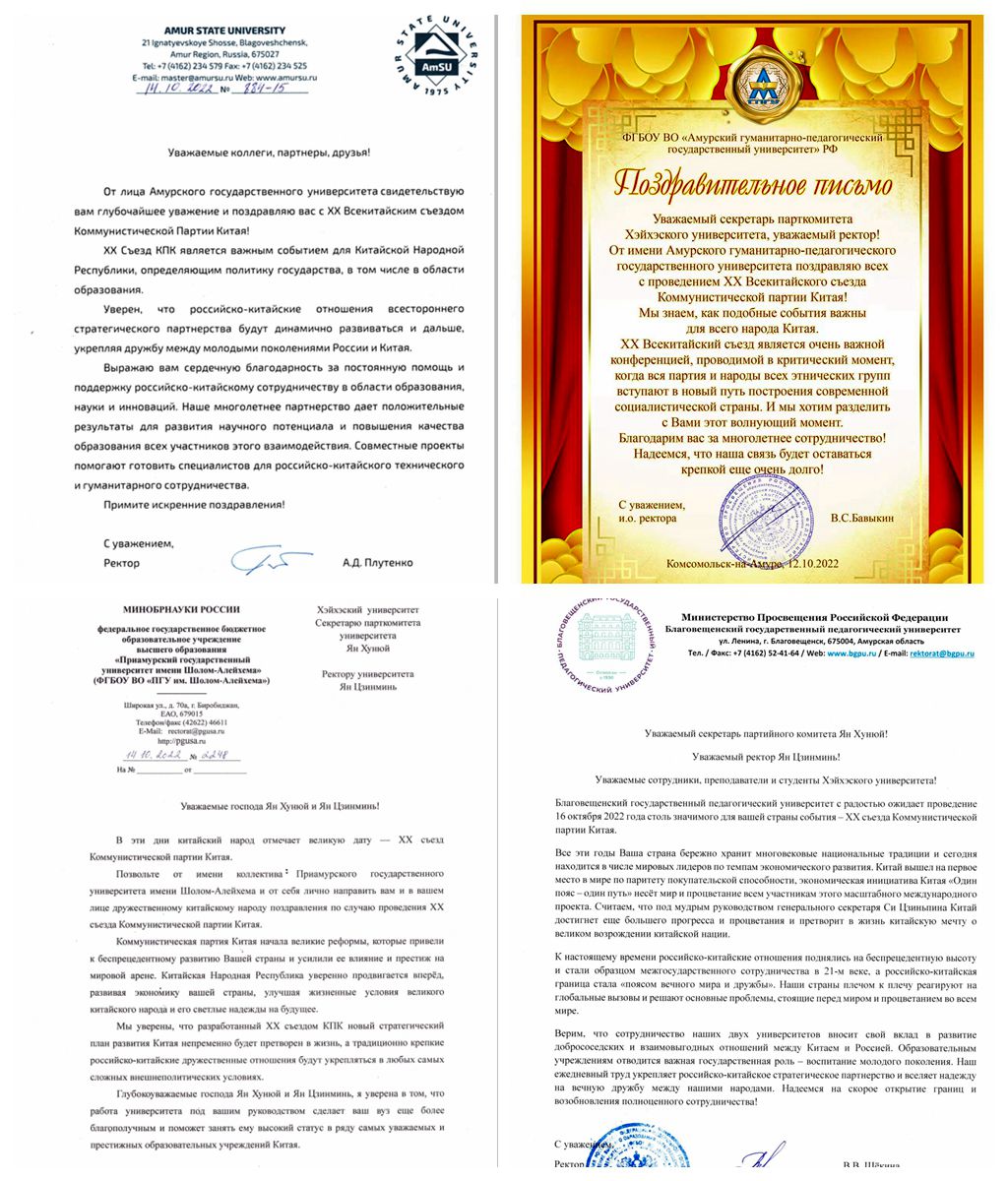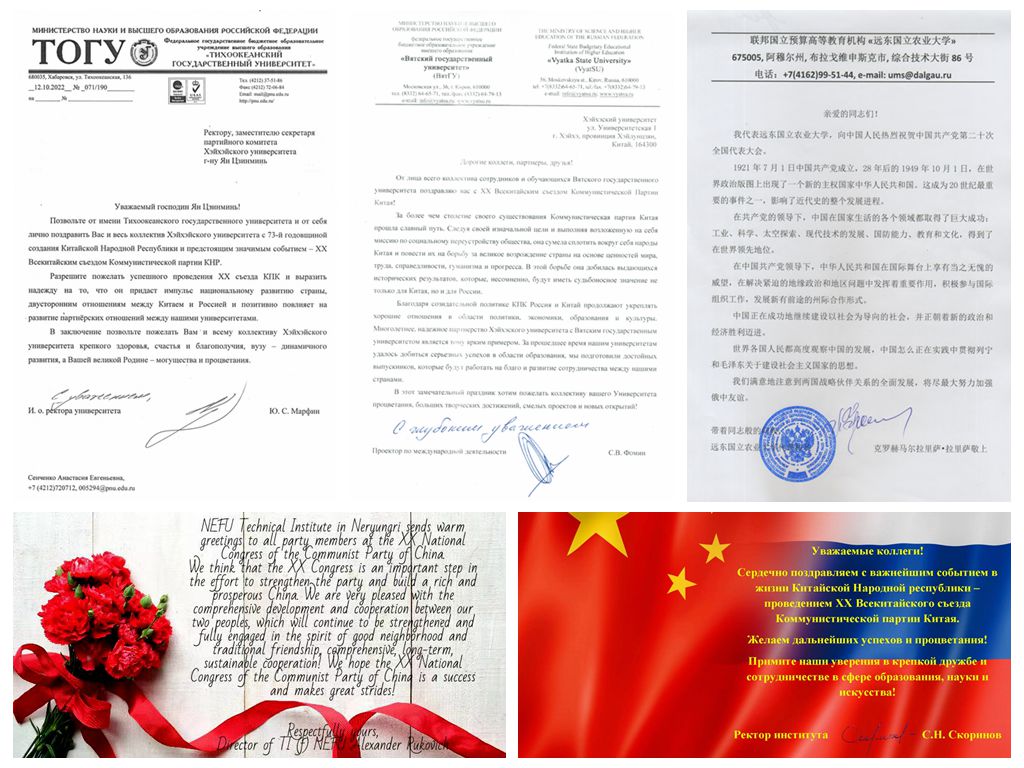 在中国共产党第二十次全国代表大会胜利召开之际,与我校友好交往的俄罗斯阿穆尔国立大学、阿穆尔国立人文师范大学、阿穆尔肖洛姆-阿莱赫姆国立大学、布拉戈维申斯克国立师范大学、东北联邦大学涅留恩格里分校、哈巴罗夫斯克国立文化艺术学院、太平洋国立大学、维亚特卡国立大学、远东国立农业大学,纷纷向我校发来贺信,热烈庆祝中国共产党第二十次全国代表大会胜利召开,并预祝大会取得圆满成功。