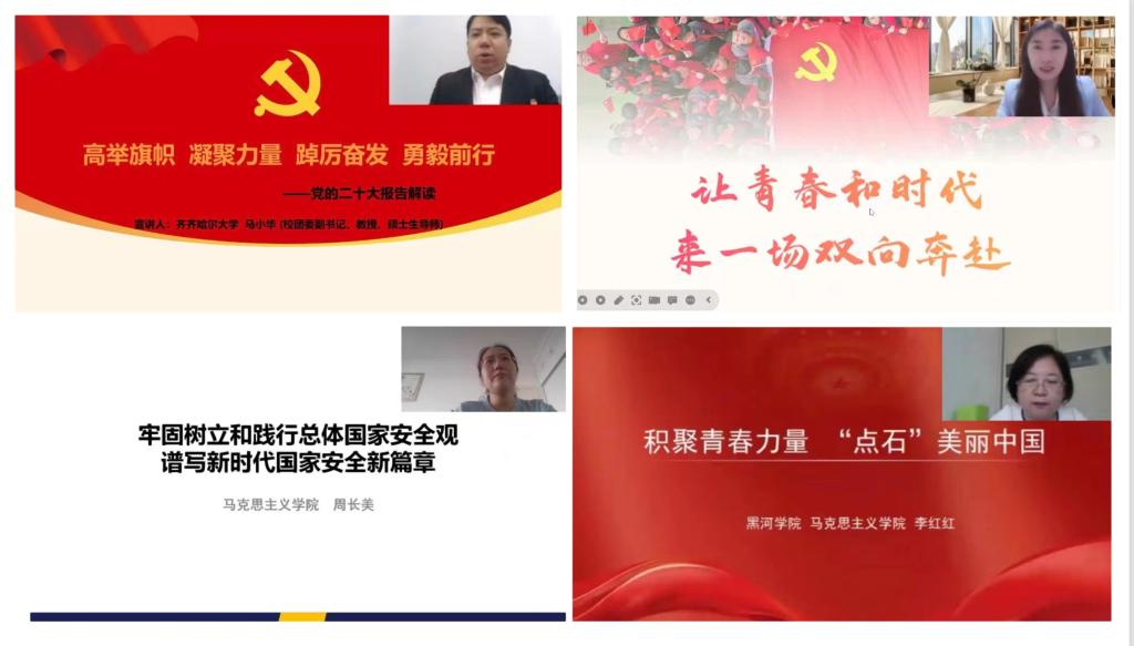 按照疫情防控要求,本期培训在线上开展了“四讲两论一测”等形式的学习活动。专题培训环节,齐齐哈尔大学党的创新理论宣讲团成员、齐齐哈尔市青年讲师团成员、齐齐哈尔大学团委副书记马小华教授,为学员们讲授了题为“高举旗帜、凝聚力量、踔厉奋发、勇毅前行——党的二十大报告解读”专题讲座;黑龙江省青年讲师团成员、共青团黑龙江省委党史宣讲团成员、东北大学马克思主义学院王馨副教授,我校马克思主义学院周长美、李红红老师分别为学员们作题为“以青春之我,弘扬伟大建党精神”“牢固树立和践行总体国家安全观,谱写新时代国家安全新篇章”“积聚青春力量 ‘点石’美丽中国”专题讲座。