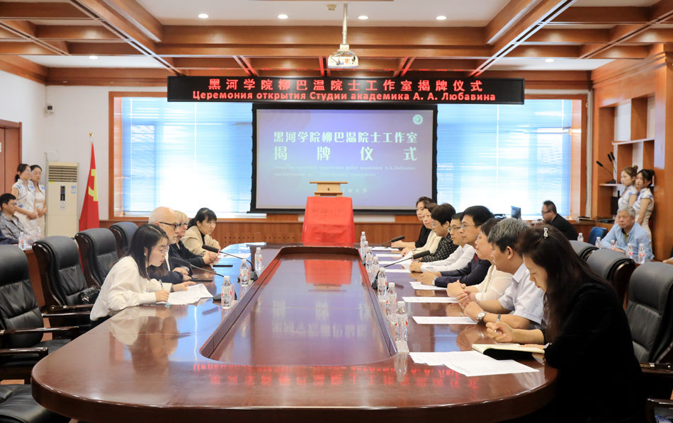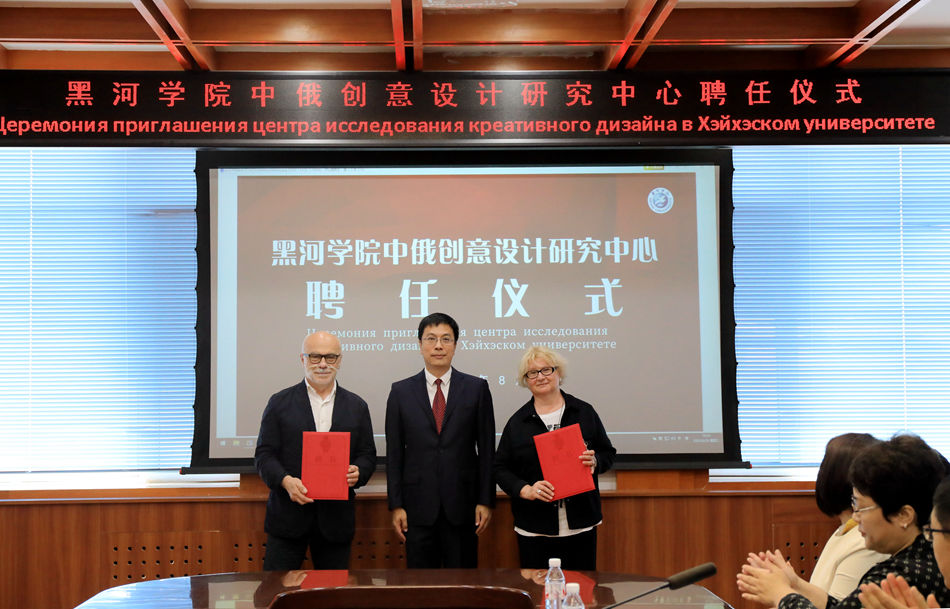 杨弘宇、柳巴温•阿纳托利•亚历山德罗维奇共同为“柳巴温院士工作室”揭牌;杨敬民分别为柳巴温院士颁发“黑河学院中俄创意设计研究中心”名誉主任聘书,为吉娜·柳巴温颁发“黑河学院中俄创意设计研究中心”特聘教授聘书。