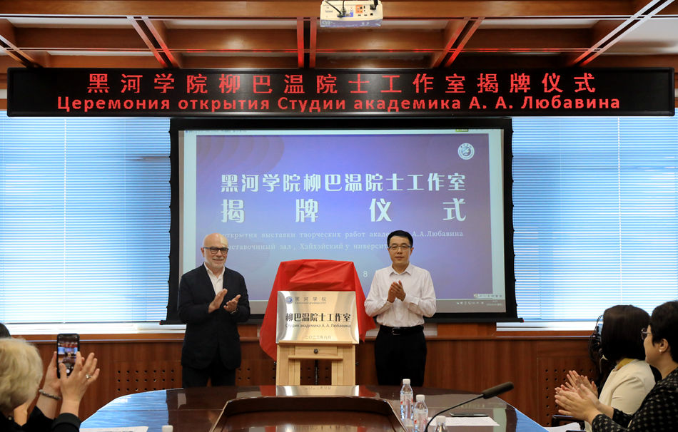 杨敬民在致辞中表示,黑河学院自2015年与莫斯科国立苏里科夫美术学院合作建立中国青年画家研修基地以来,已成功举办了六期研修班,充分发挥黑河学院对俄交流合作的桥头堡作用,为省内外画家搭建起与世界公认的顶尖艺术院校——莫斯科国立苏里科夫美术学院近距离交流平台,越来越多的青年画家、油画教师依托此平台不断实现专业提升。今天揭牌建立“柳巴温院士工作室”,聘任柳巴温院士为“黑河学院中俄创意设计研究中心”名誉主任,聘任尼娜•柳巴温娜院士为“黑河学院中俄创意设计研究中心”特聘教授,进一步有力推动了黑河学院与苏里科夫美术学院大师及团队的实质性合作,对深化学校办学特色,培养高层次艺术人才、开展高端学术交流、促进中俄文化传播发挥更大作用。
