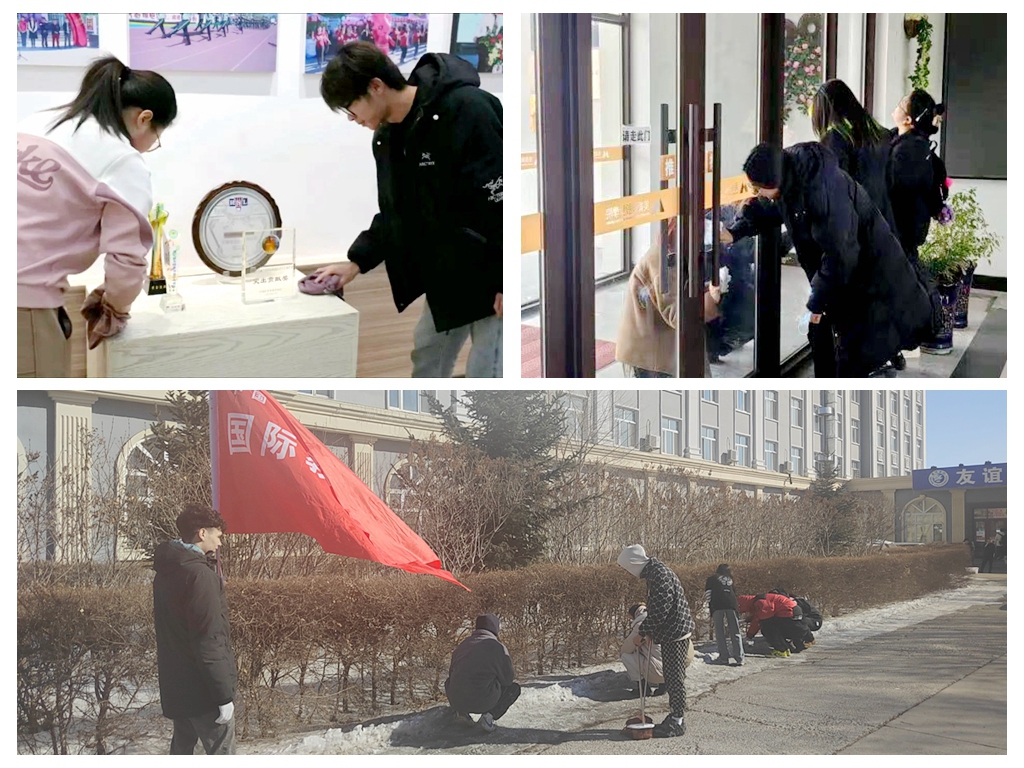 人文传媒学院学子走进校史馆,认真擦拭陈列柜、清扫地面,再次回顾我校历史,切身感受了学校深厚的文化底蕴,激发了大家的爱校荣校情怀,增强了对母校的认同感、归属感、自豪感。美术与设计学院学生对美术教学楼、实践中心等楼内、前后道路以及停车场等地进行清理;国际教育学院学生对学校教学楼过道旁、操场边、体育馆等区域进行了地毯式的认真清扫,同学们在劳动中感悟学校的发展变化和雷锋精神的代代传承。