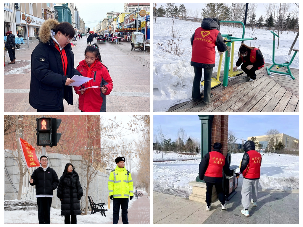 外国语学院学生来到中央大街、海华广场、体育公园等地,分发《中华人民共和国宪法》《未成年人保护法》等法治宣传资料,认真倾听和耐心解答群众提出的法律诉求和问题;理学院、体育学院学生带齐工具,分别走进公园等公共场所,清洁公共设施,用实际行动传递自觉维护环境卫生的责任和意识,为文明城市建设贡献青春力量;计算机与信息工程学院联合黑河市公安交通警察支队开展交通文明劝导志愿服务,同学们手拿交通指示小红旗,坚守岗位指挥过往行人按指示灯通行、对无视红绿灯的群众进行劝阻和安全教育,弘扬雷锋精神,优化城市环境,共建文明家园。