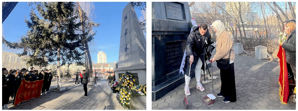 国际教育学院组织中俄青年开展清明节“缅怀革命先烈 携手捍卫和平”祭扫烈士墓活动。在王肃烈士墓和苏联红军烈士塔前,中俄青年默哀致敬,敬献鲜花。来自俄罗斯籍的留学生塔尼娅在苏联红军烈士墓前深情地说,“中俄两国是友好的国家,在黑河的土地上还建有牺牲的苏联红军烈士塔,让我非常感动,更加希望世界上没有战争,永远和平。”