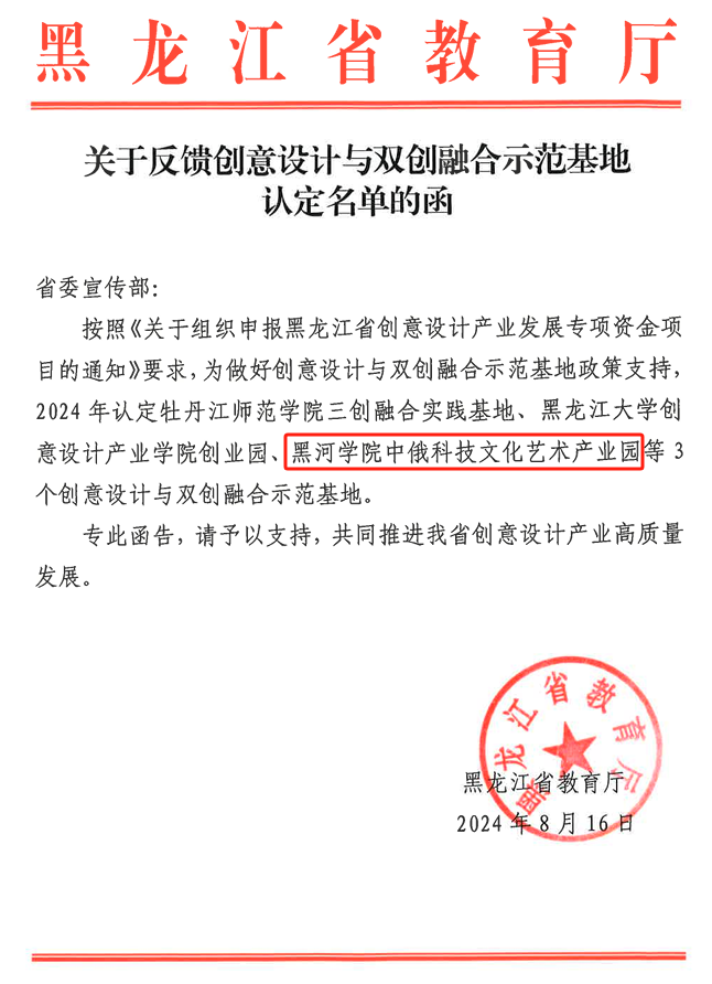 近日,我校“黑河学院中俄科技文化艺术产业园创意设计与双创融合示范基地”经高校自主论证申报、省教育厅组织专家网评和现场评议后,获批黑龙江省创意设计与双创融合示范基地。学校将持续依托该基地,以培养高素质应用型“双创”人才、推进中俄文化艺术产业合作为目标,聚集中俄艺术教育资源、激发大学与企业间的创新活力,助力中俄区域经贸合作和中俄人文合作发展,推动中俄创意设计产业迈上新台阶。