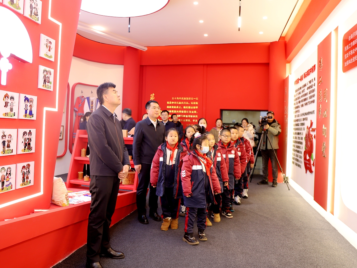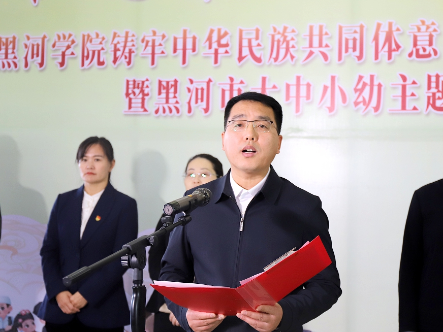 本网讯(记者 黄思翼)为贯彻落实习近平总书记关于加强和改进民族工作的重要思想,牢牢把握铸牢中华民族共同体意识这一工作主线,持续加强民族团结进步教育,扎实推进民族团结进步示范校创建,11月16日,我校于明德楼举行“祖国最北 思想最牢”铸牢中华民族共同体意识主题展馆揭牌仪式暨大中小幼主题实践活动。我校党委副书记、组织部部长安全义,黑河市委统战部常务副部长、民宗局局长董超,黑河市委宣传部副部长王秀玲,爱辉区委常委、统战部部长李慧,四嘉子满族乡中学校长张广建、副校长范洪国,爱辉区西岗子中学校长张辉,黑河市第三中学党支部副书记薛艳彬,我校学生工作部、团委负责人、各党总支书记;二公河幼儿园、第五小学、第三中学、四嘉子满族乡中学、西岗子中学及我校教师和学生代表共同参加仪式。