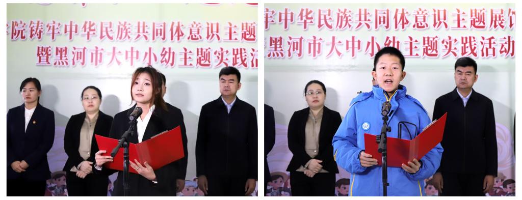我校教育科学学院2022级小学教育专业李津汀、黑河市第三中学初一二班周子涵代表全市大中小学生发言,表示将充分利用好主题展馆,积极参与实践研学、文化交流等活动,不断深化对铸牢中华民族共同体意识的认识,进一步增强民族自豪感和自信心。