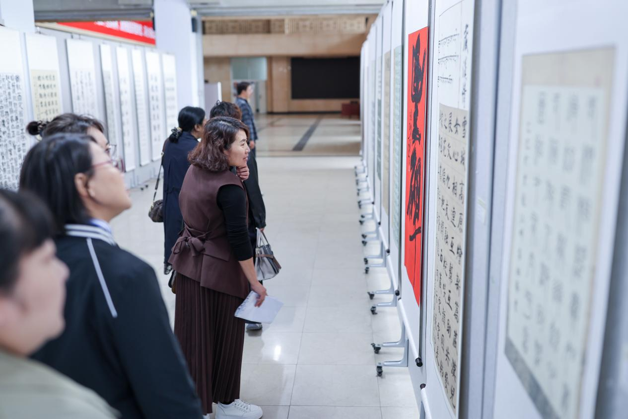 开幕式后各学院代表教师在明德楼一楼,参观“纪念中国人民抗日战争暨世界反法西斯战争胜利80周年书法绘画展”。本次展览由学校联合国家语言文字推广基地、黑河市美协、书协共同举办,展出书法、国画、油画及版画作品50幅。一幅幅“歌颂祖国、宣扬红色精神”的磅礴行书、楷书,“各族儿女心向党”的绚丽画卷,把观众带回硝烟与信仰交织的岁月。