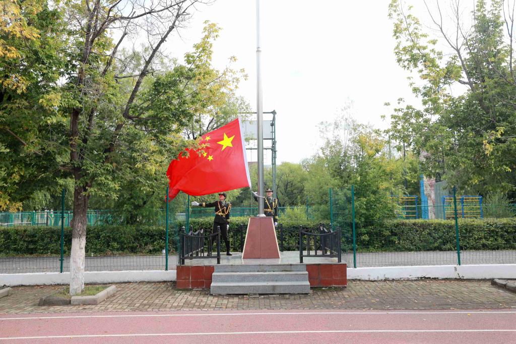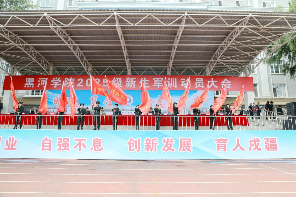 随着国歌奏响,五星红旗在运动场冉冉升起,全体人员肃立行注目礼,大会在庄严的升旗仪式中拉开序幕。带队教官随后宣读《黑河学院2025级新生军训计划》及《考核评比办法》,从军事技能训练到国防理论学习,详细部署军训期间的教学安排与考核标准,为新生明确训练方向。授旗环节中,承训部队领导向谢慧授予"军训大队旗",谢慧依次为各学院授"军训中队旗"。
