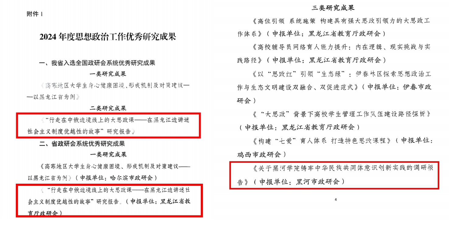 近日,黑龙江省思想政治工作研究会发布了《黑龙江省政研会关于2024年度优秀研究成果和2025年基层创新案例的情况通报》,我校马克思主义学院报送的《“行走在中俄边境线上的大思政课——在黑龙江边讲述社会主义制度优越性的故事”研究报告》入选全国政研会系统优秀研究成果(二类)、省政研会系统优秀研究成果(一类);宣传统战部报送的《关于黑河学院铸牢中华民族共同体意识创新实践的调研报告》入选省政研会系统优秀研究成果(三类)。
